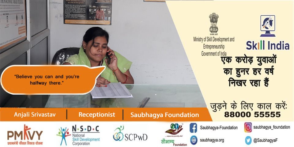 My name is Anjali Srivastava. I have 100% disability. I want to prove myself in a positive way that nothing is impossible in the world. I joined Saubhagya Foundation under PMKVY for Domestic Data Entry Operator and now I am working with Saubhagya Foundation as Receptionist. Joining here is one of the most happiest moment of my life.