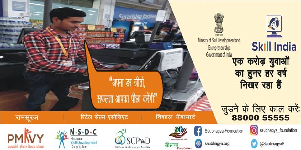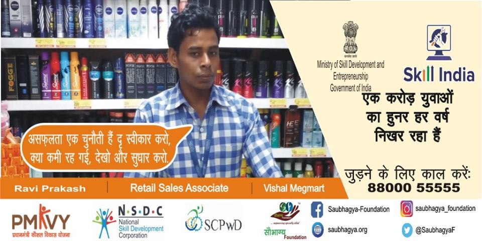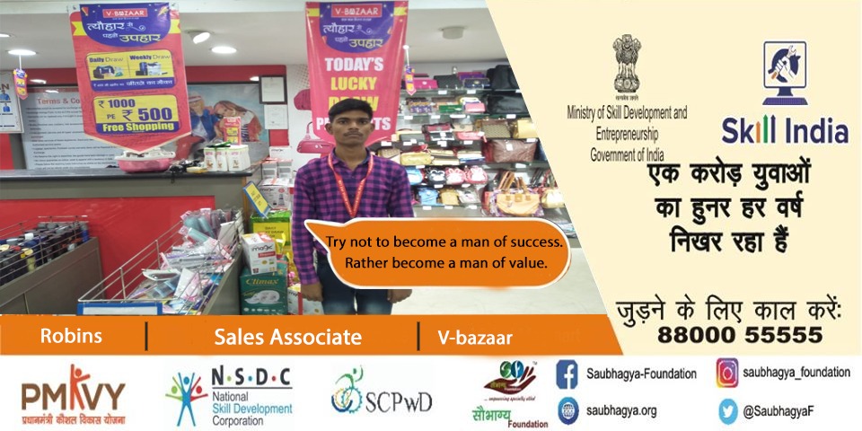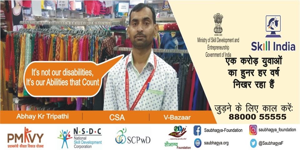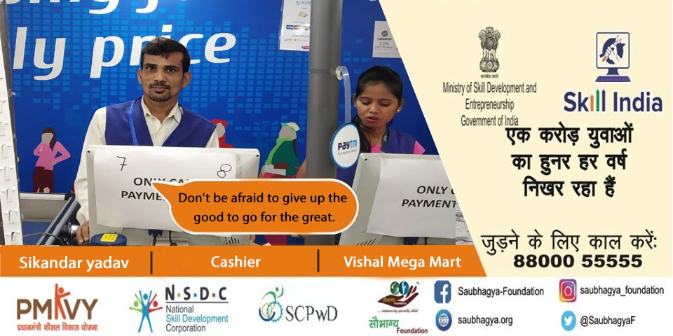 My Name is Sikander Yadav. I have 60% orthopedic disability. I belong to a small village in Gorakhpur. We are a family of 5. I joined the course of In Store Promoter at Saubhagya Foundation and currently working as a cashier at Vishal megamart, Gorakhpur. Being connected with Saubhagya I learned no matter what you don’t have, if you are determined enough you can achieve any success you dreamt of.