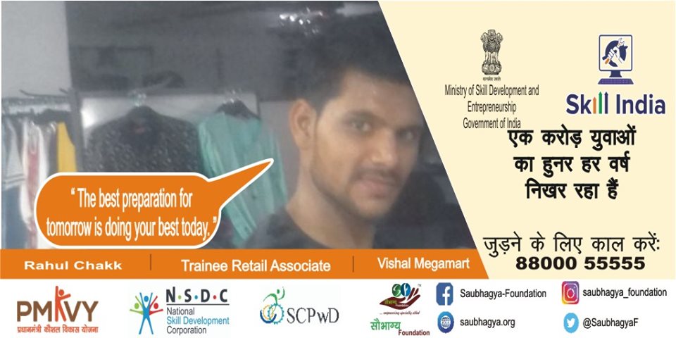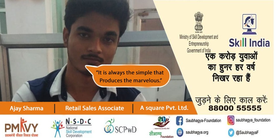 I am Ajay Sharma, I have 60% orthopedic disability. I am a son of a ex-soldier and my mother is a house-wife. I was very disappointed because of my disability. My life changed when I came in contact with the saubhagya foundation. I have done a course of Retail Sales Associate under skill India campaign and now I am working with ‘A square Pvt. Ltd.’ Today I can earn for myself and support my family, making me proud of myself.