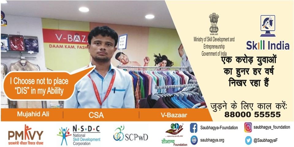 मेरा नाम मुजाहिद अली है, मैं लखनऊ का रेहने वाला हूं, मैं बोल और सुन नहीं सकता पर स्किल इंडिया के अंतर्गत मैंने कोर्स किया और आज मेरी नौकरी V-Bazaar में लग गई है, जिससे आज मेरी ज़िन्दगी को एक नयी राह मिल गयी है।