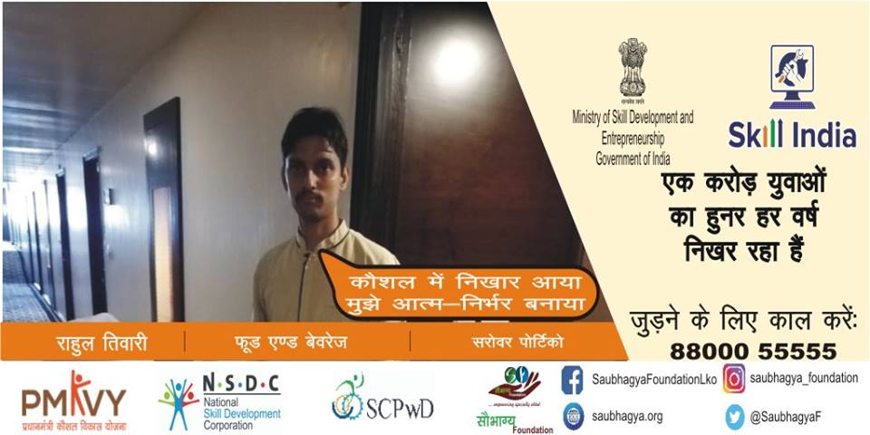 मेरा नाम राहुल तिवारी है, मैं लखनऊ का रेहेने वाला हूँ, मैं सुन और बोल नहीं सकता, मैने Skill India के अंतर्गत ट्रेनिंग की है और सरोवर पोर्टिको होटल में आज मेरी जॉब लग गयी है