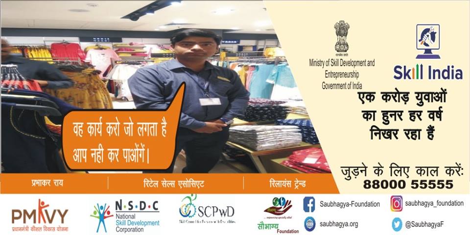 मेरा नाम प्रभाकर राय है. में लखनऊ जिले का निवासी हूँ, मैं बोल व सुन नहीं सकता, Skill India के माध्यम से ट्रेनिंग करने के पश्चात मुझे रिलायंस ट्रेंड में नौकरी मिल गई जिससे में बहुत खुश हूँ.