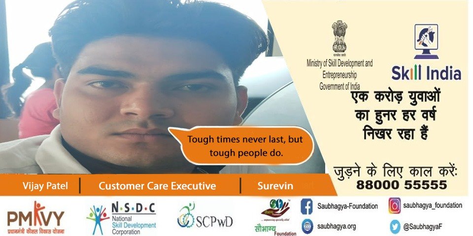 My name is Vijay Patel. I have a 100% disability. There are six members in my family. My father is a farmer. Then to support my family, I took training from Saubhagya Foundation under Skill India Mission and currently I have been placed in SUREVIN as Customer Care Executive. It is indeed one of the happiest days of my life.