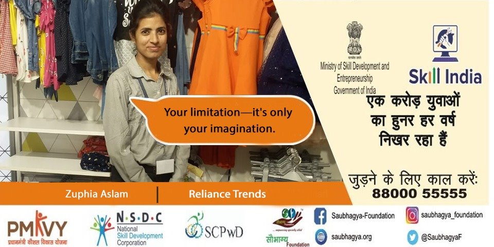 मेरा नाम आसमा बानो है, मैं लखनऊ की निवासी हूँ, मेरी दिव्यांगता 50% है, Skill India की ट्रेनिंग के माद्यम से आज में विशाल मेगामार्ट लखनऊ में रीटेल सेल्स एसोसिएट की जॉब कर रही हूँ, आज Skill India के इस मिशन ने मानो मुझे 100% अपने पैरो पर खड़ा कर दिया है.
