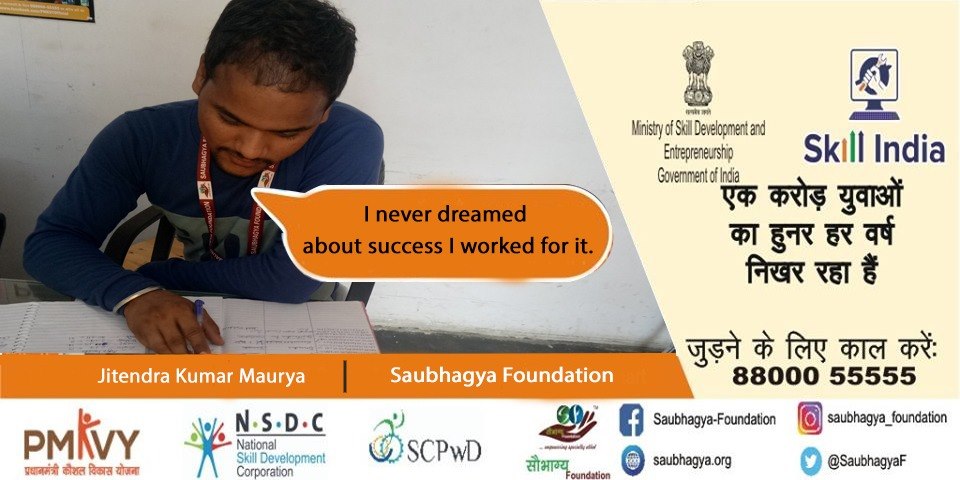 मेरा नाम जितेंद्र मौर्या है। मैं लखनऊ के रहनेवाला हूँ। मेरी दिव्यांगता एक पैर से 45% है। मैंने प्रधान मंत्री कौशल विकास योजना के प्रशिक्षण केंद्र सौभाग्य फाउंडेशन से कोर्स किया और कोर्स करने के तुरंत बाद ही सौभाग्य फाउंडेशन ने मुझे अपने यहाँ ही नौकरी दी। आज मैं अपने दिव्यांग पिताजी का सहारा बन कर बहुत खुश हूँ।