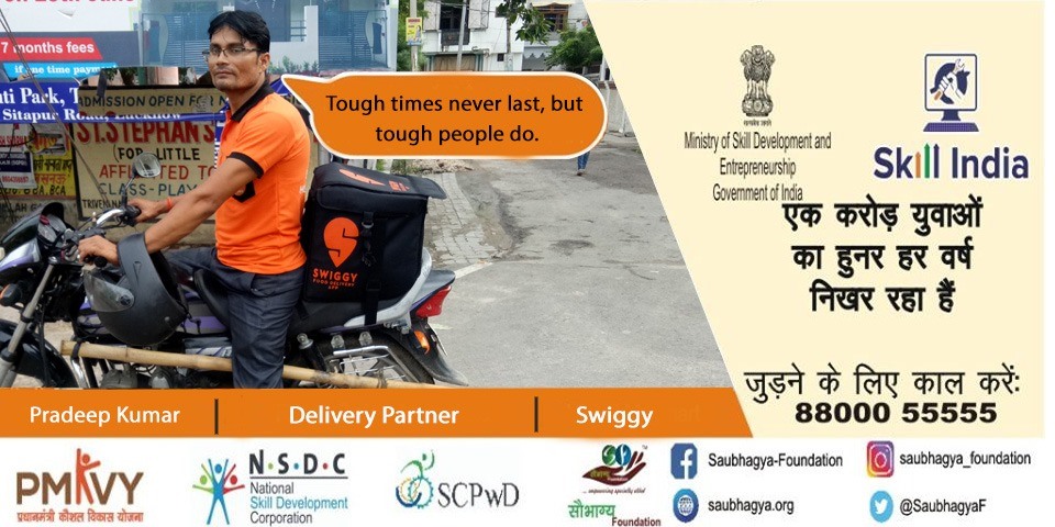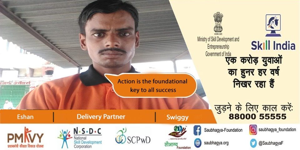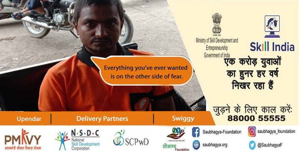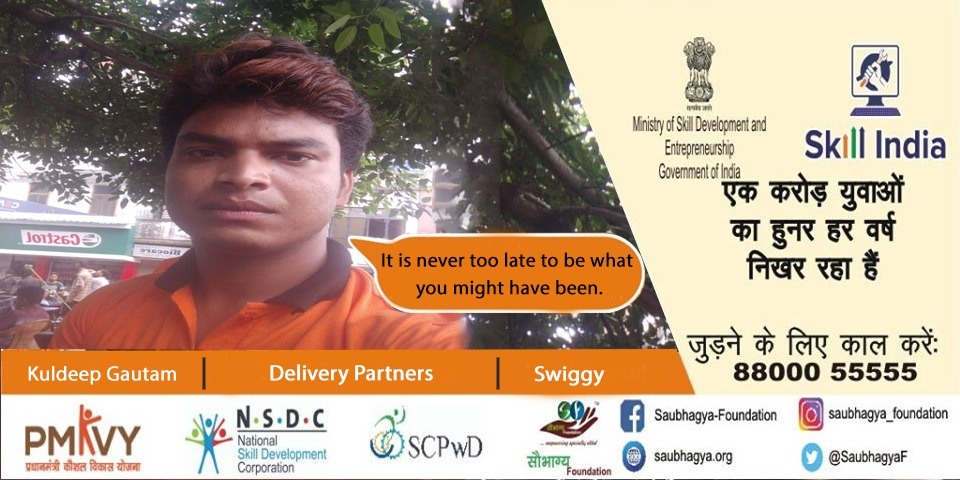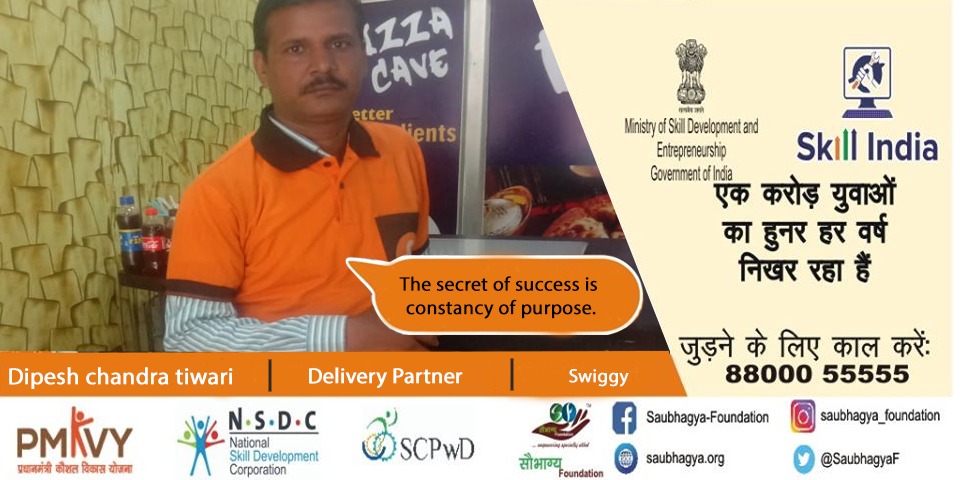 My name is Dipesh Chandra Tiwari. I am a farmer’s son and my mother is a housewife. I have 90% orthopedic disability. We have a family of 11 members residing at Lucknow. Saubhagya has appeared as a ray of hope in my life as I was driven to the greener side of the life. I took the benefit of skill india mission and now I am working as a delivery partner at swiggy. Now I too can live a life full of self respect by earning a good income for my family.