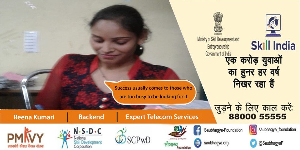 My Name is Reena Kumari. I have 80% orthopedic disability. I am a graduate. My father is a private clerk and I am from Azamgarh, I have done the Customer Care Executive course from Saubhagya Foundation and now I am working with Expert Telecom Services as Backend executive. During my training I have motivated to fulfill my dreams and achieve all my aspiration. I am all set to work hard to achieve my dreams.