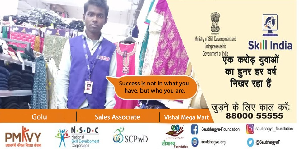 My name is Golu. I have 40% orthopedic disability. I am a proud son of a farmer residing at Allahabad. We are a family of seven. My basic education is class 12th. I was moving aimlessly in my life till the time I joined Saubhagya Foundation. I was redirected with the positivity and high hopes to achieve all my dreams in life. Today I am working as Sales associate at Vishal Mega Mart.