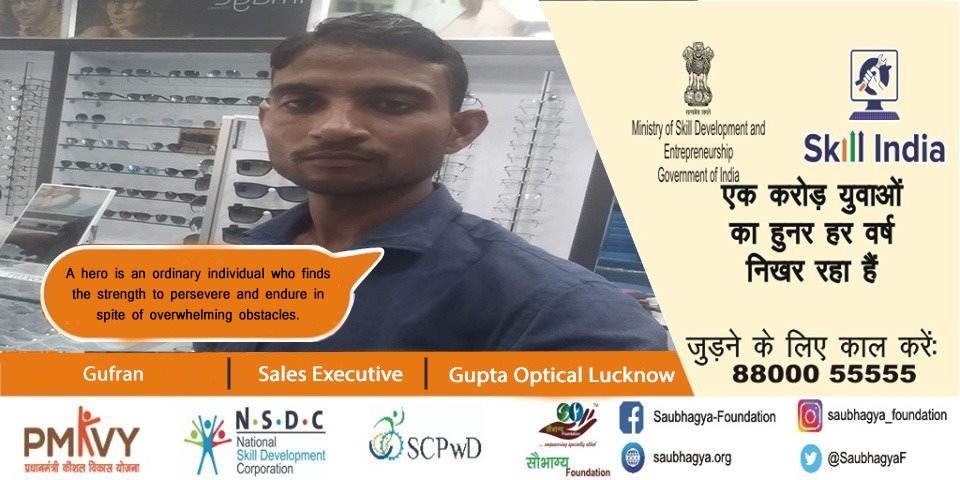 My name is Gufran, I am from Lucknow. I have hearing impairment disability. My father is Milkman and he goes door to door to supply milk in his area. I have done the course from Saubhagya Foundation and after competition of my course I have been placed with Gupta Opticals as Sales Executive. I am unable to express my feeling that how much i am happy to become supporting hand to father.