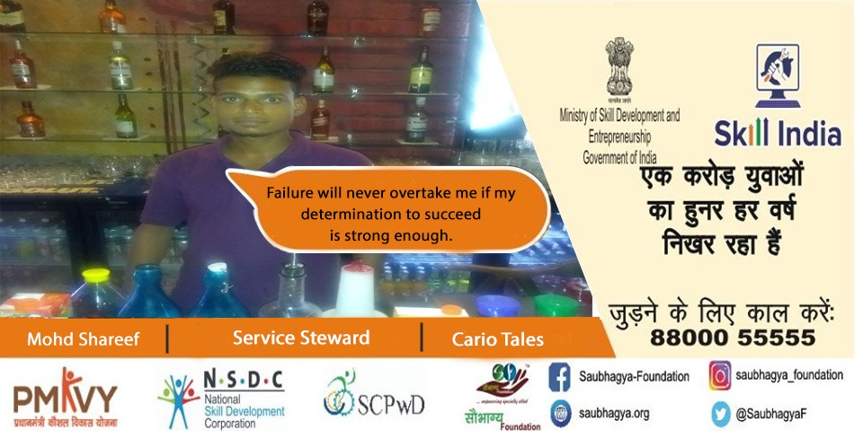 I am Mohd Shareef. My father is a retired supervisor from swaccha retail. We are a family of 5 living at Lucknow. I was moving aimlessly in my life till I came to know about Saubhagya foundation. Under the Skill India mission I got a chance to live my dreams again. I did the Food & Beverage - Service Steward Course and now I am working as Service Steward at Cario Tales.