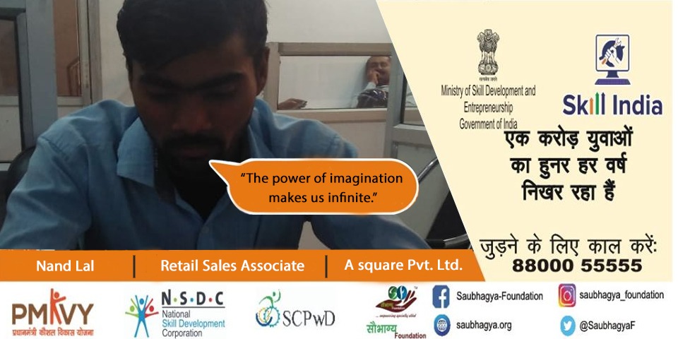 My name is Nand Lal. I have 50% orthopedic disability. My mother is a housewife and my father is no more. We have a family of 8 members. I am from a small town Bhadohi, Uttar Pradesh. I came to know about Saubhagya Foundation and under the skill India campaign I did the course of Retail Sales Associate and currently working at ‘A square Pvt. Ltd.’. My life completely changed with Saubhagya foundation as I gained a new confidence and my attitude towards life changed. I am also pursuing my graduation along with my job.